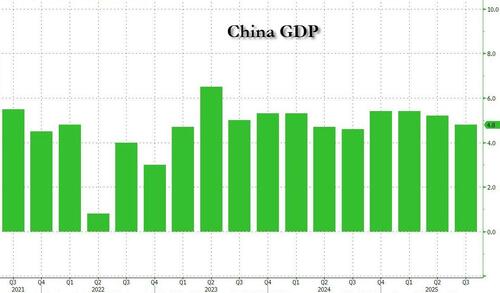 That’s the optimistic view. A rather more realistic one comes from Reuters which writes that Beijing may be using the headline “resilience” in growth as a show of strength in talks between its vice premier He Lifeng and Treasury Secretary Scott Bessent in Malaysia in coming days and a potential meeting between presidents Donald Trump and Xi Jinping in South Korea later.