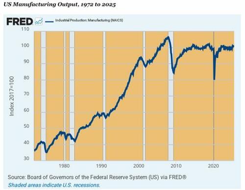 It shows that for all their wild-ass money printing in recent years, the US index of manufacturing output stands at 101.39, which is nearly 5% below the level reached on the eve of the financial crisis in December 2007.