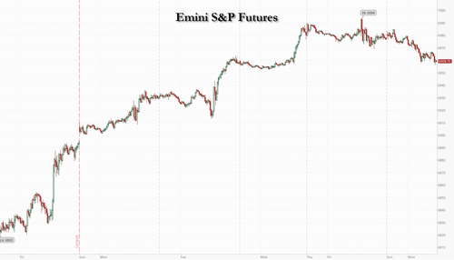 In premarket trading, Tesla and Nvidia underperform Mag 7, putting pressure on US stock futures (Tesla -1%, Nvidia -1%, Alphabet -0.5%, Meta -0.4%, Apple -0.2%, Microsoft -0.1%, Amazon +0.1%)