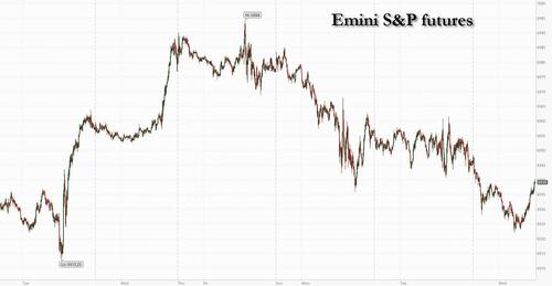 Stocks are ending a third straight year of double-digit gains in subdued fashion as an expected seasonal rally fails to gain traction. Silver’s volatile ride extended to another session, with the metal tumbling after the CME hiked margins for the second time in three days. As of 8:15am ET, S&P 500 futures fell 0.1% and well off session lows, after a stretch of post-Christmas losses pared the benchmark’s advance for 2025 to 17%, just shy of the 20%+ gains 2021, 2023 and 2024. Nasdaq 100 contracts were down 0.3%.Both indexes have drifted lower for the past three days amid a rotation out of growth and momentum stocks and into value and quality names in seasonally. Silver plunged as a run of price moves of 5% or more entered a fourth day. The dollar is steady as it heads for an annual decline of about 8%, the steepest since 2017. Treasury yields are ticking lower after Tuesday’s FOMC minutes offered nothing to shake expectations rates will be left unchanged when policymakers meet again in January, with further cuts likely later in the year. The only economic data on today’s calendar is the weekly initial claims which printed far below expectations at 199K (est.218K).