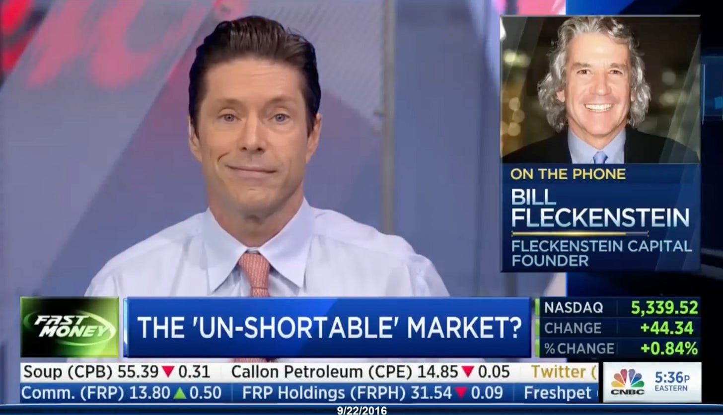 As I first noted back in 2023, my disdain, distrust and general disgust for financial media reached a peak in 2016 when CNBC’s Fast Money invited Bill Fleckenstein on the air to offer up his take on the economy and why the Fed-fueled market was “un-shortable”.
