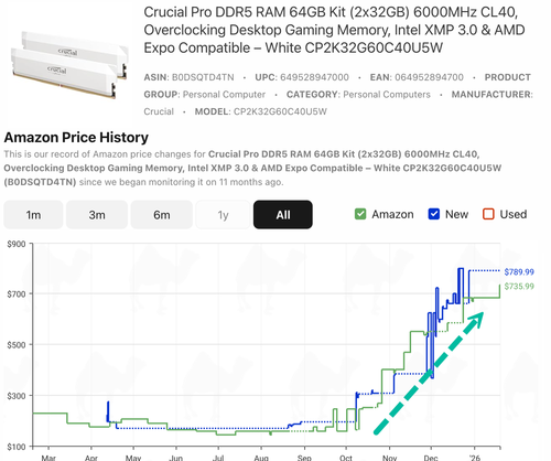 Amazon price-tracking website CamelCamelCamel shows a parabolic price surge in Crucial Pro DDR5 64GB RAM, rising from $145 to $790 in just six months. Anyone building a gaming PC to power a trading station must be furious, as the greatest memory crunch of our time is now underway and could worsen in the months ahead.