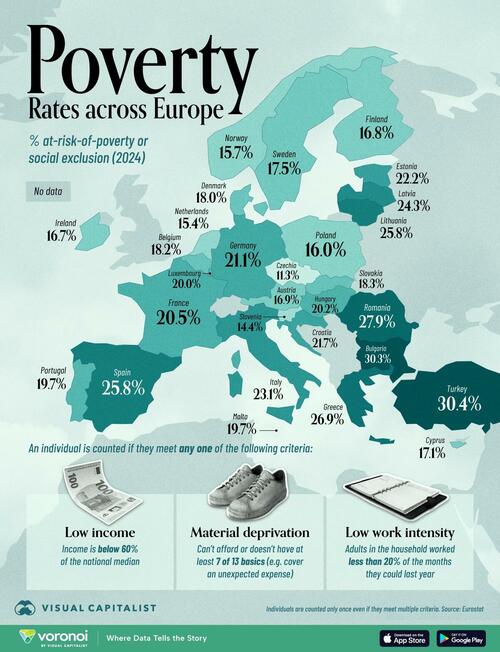 The map below, via Visual Capitalist’s Pallavi Rao, spotlights Europe’s poverty rates in 2024, measured by the share of people at risk of poverty or social exclusion in each country.
